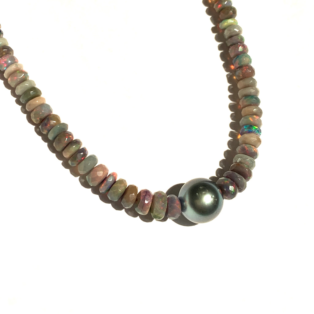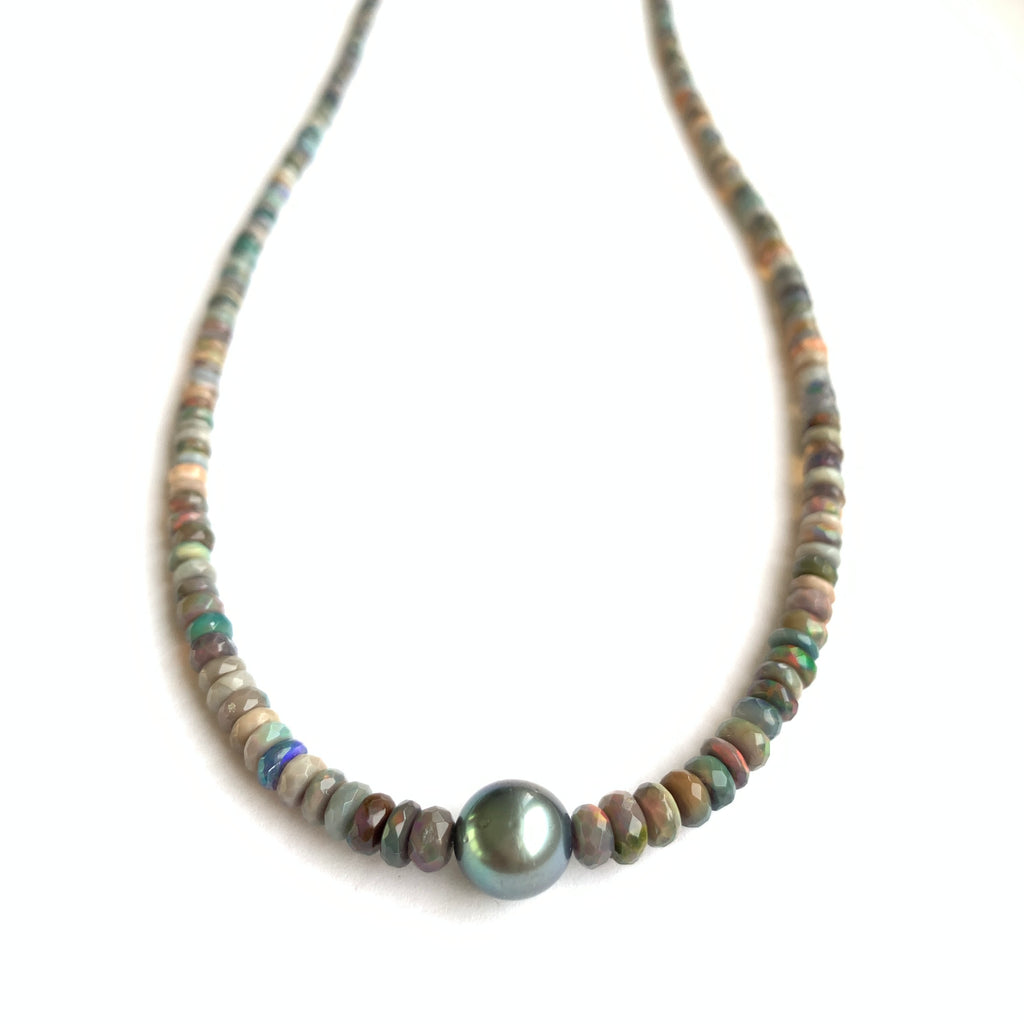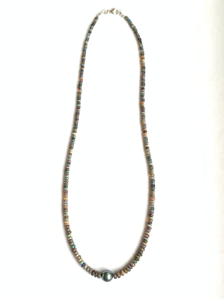 Faceted Ethiopian opals are strung from stainless steel cable and adorned with a Tahitian pearl. Finished with a sterling silver lobster clasp. Necklace measures approximately 18 3/8 inches.